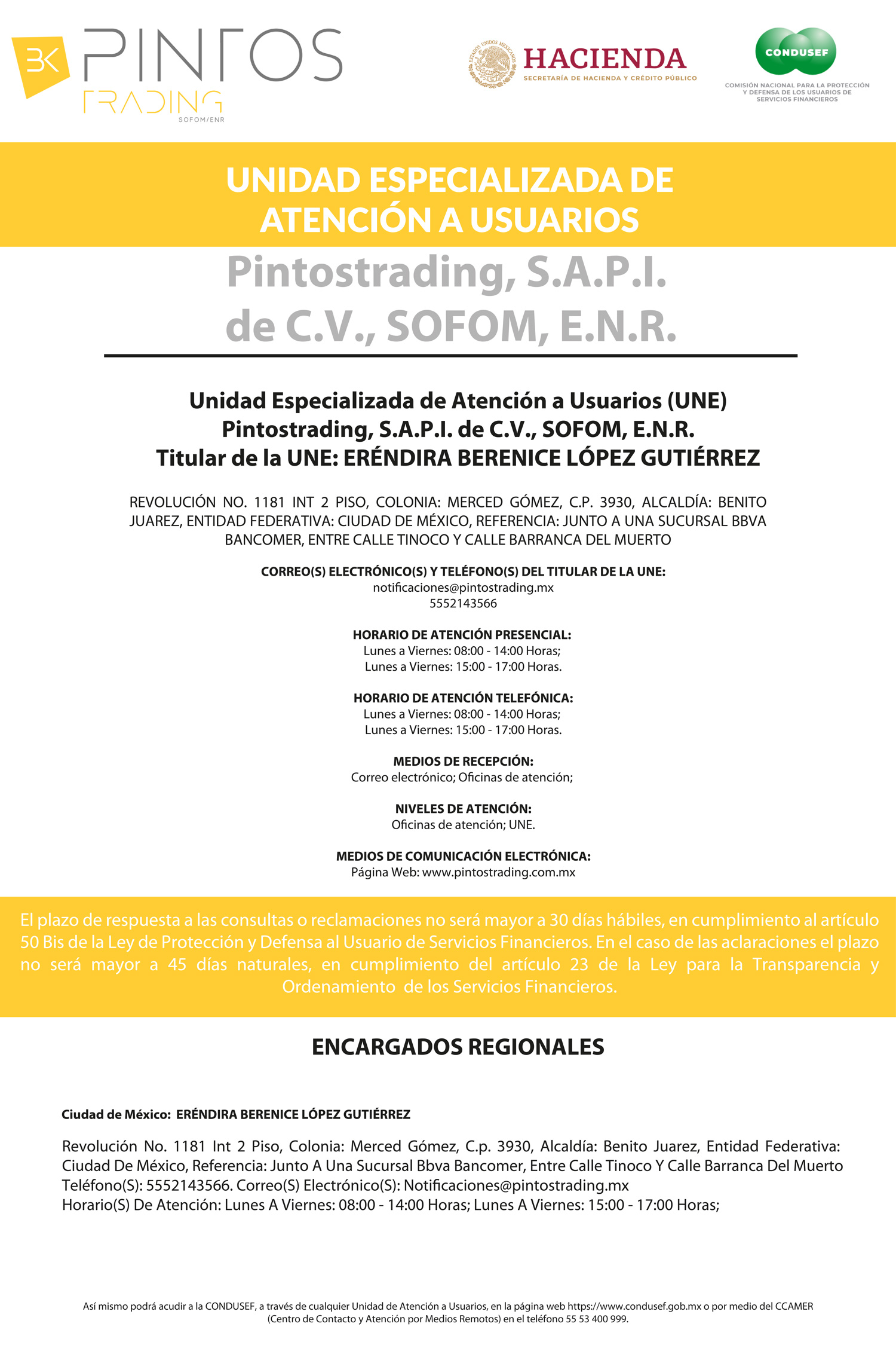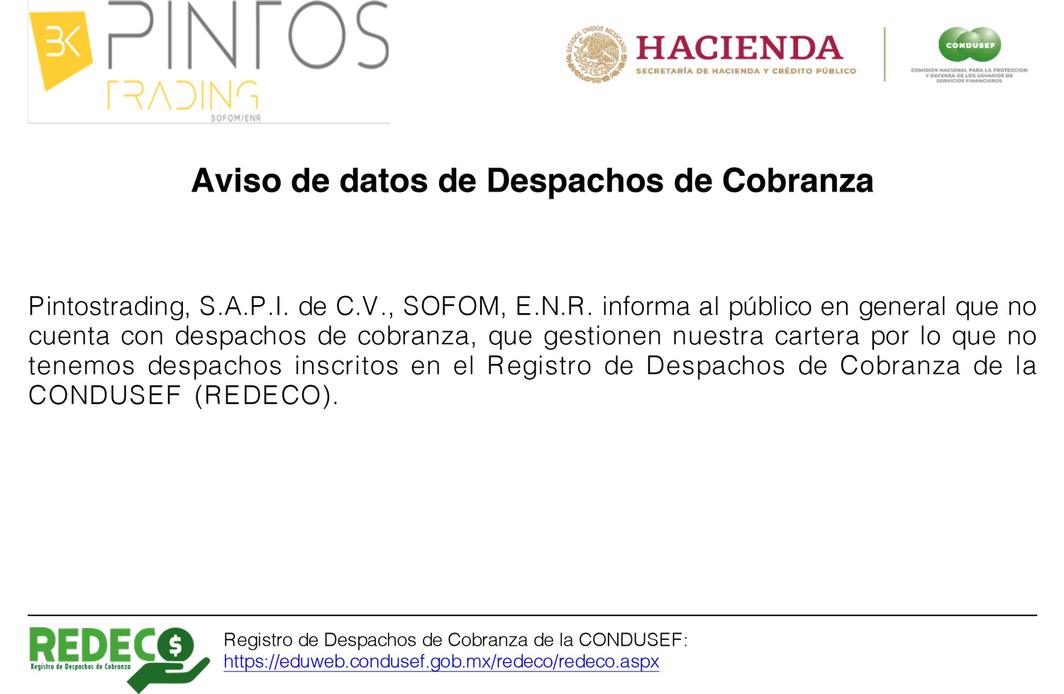 La información corresponde únicamente a Pintostrading, S.A.P.I. de C.V., SOFOM, E.N.R., y para conocer la información de todo el sector al que corresponde, se podrá acceder al sitio http://www.buro.gob.mx/